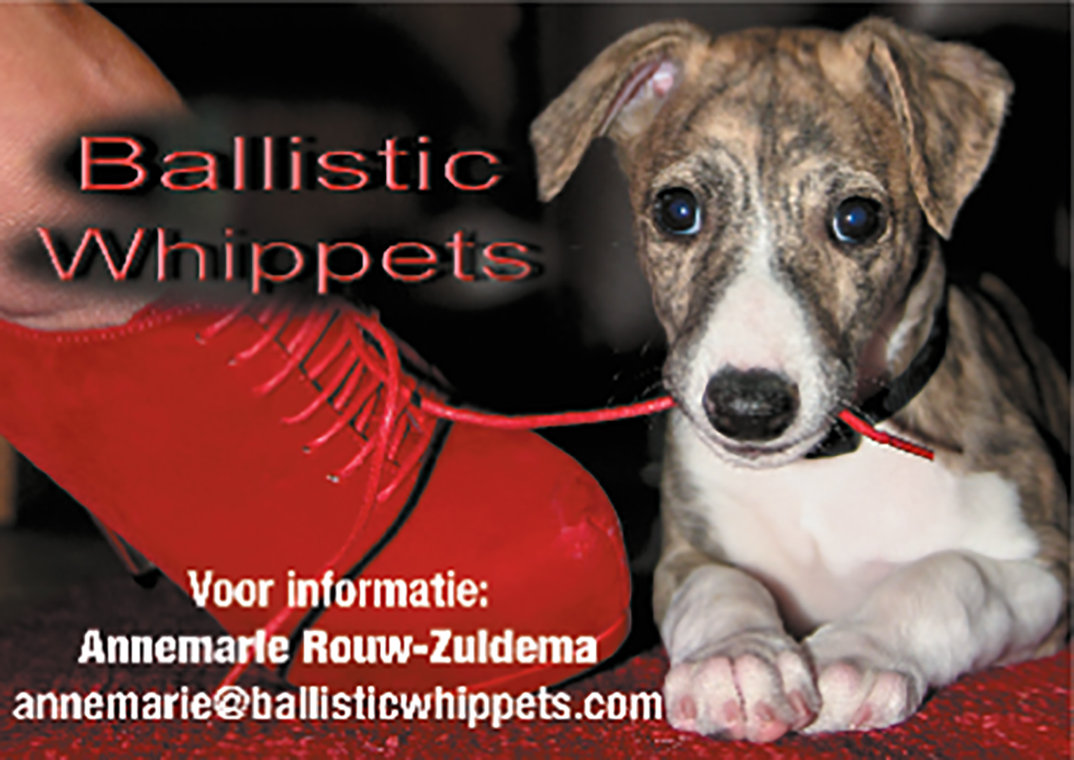 ![]() | BALLISTIC WHIPPETS Annemarie Rouw-Zuidema Herdersveld 77 5665 JL Geldrop 040-2857363 / 06-43394235 annemarie@ballisticwhippets.com www.ballisticwhippets.wordpress.com |